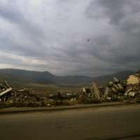 - Building rubble on the side of a road, with mountains in the background