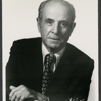 - Portrait photo of older man in suit and tie looking intently at viewer with folded arms. Signature at bottom right corner reads "Maurice Seymour, Chicago"