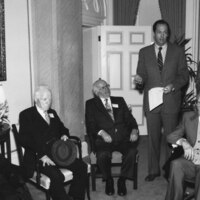 - Three older men in suits and tie and an older woman sit next to each other, all wearing nametags. Two men in suits and tie stand next to each other behind them. The standing man on the left speaks and holds a sheet of paper.